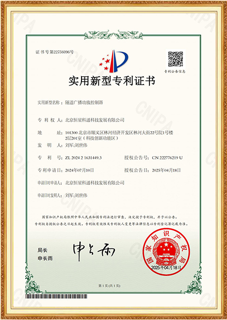近日,北京恒星科通科技發(fā)展有限公司(以下簡稱“恒星科通”)再傳捷報,公司自主研發(fā)的“隧道廣播功放控制器”和“一種全向廣播”兩項技術成果,正式獲得國家知識產(chǎn)權局頒發(fā)的實用新型專利證書。這標志著恒星科通在專業(yè)廣播通信領域的技術創(chuàng)新能力再獲國家級認可。