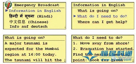 通過DRM發(fā)布的應(yīng)急廣播信息可以包括音頻通知,也可以基于DRM標(biāo)準(zhǔn)化的Journaline服務(wù)組件(DRM核心功能模塊之一)發(fā)布增強(qiáng)文本信息。結(jié)構(gòu)化的文本功能使用戶能夠在DRM數(shù)字廣播接收機(jī)屏幕上快速查找相關(guān)信息,相比音頻提供更為詳細(xì)的內(nèi)容。
